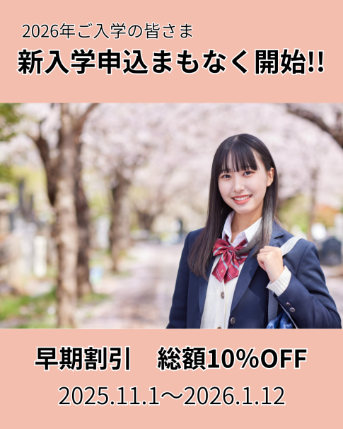 お知らせ 2026年新入生申し込みについて2025.10.1611月より2026年ご入学の方の採寸申込が開始いたします。 採寸予約につきましては、HPの「ご来店予約」よりご予約をお願い致します。 土日は大変混みあいます。余裕をもってのお申込みをお勧めいたします。 なお!今年も総額1...