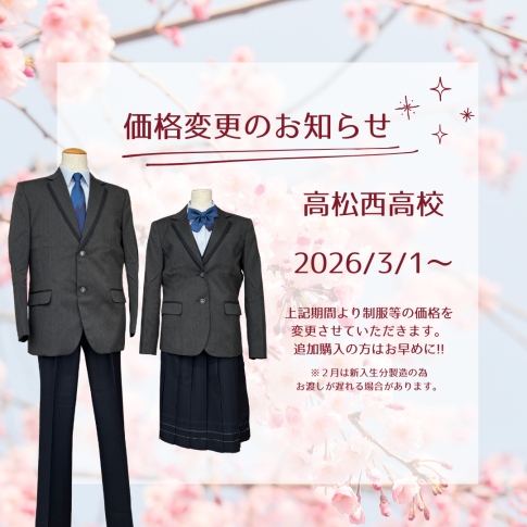 お知らせ 高松西高校の制服価格変更のお知らせ2025.10.16下記日程より在校生の方対象に制服等の商品の価格を変更いたします。 〈価格変更開始日〉 2026年3月1日(日)~ 2月に入りますと、新入生分製造の為お渡しが遅れる可能性があります。 お早めにお買い求めください。 ※新入生...